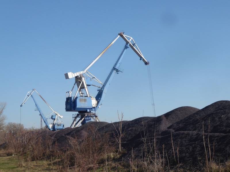 Der Hafen ist trotz der verlassenen Gebäude immer noch lebendig und gut. Ich schließe die Augen, denn die Industrielandschaft hat nicht nur einen Anblick, sondern auch einen Klang. Der Motor eines Schubbootes heult zweimal auf, dann schwappt seine riesige Ladung in kleinen Wellen auf ihr Ziel zu. Von der anderen Seite des Beckens ist das rhythmische Rattern von Lokomotivpfeifen und Güterwagen zu hören. Das sind die großen, man könnte sagen feierlichen Geräusche. Neben mir jedoch ist ein ständiges Klappern zu hören, das fast den Rhythmus vorgibt: das Greifen der Ladung, das Klappern der Metallseile, das Drehen des Ganz-Krans, wieder das Klappern der Seile und dann der schnelle Trommelschlag der Ladung, wenn sie über dem Schiff abgeladen wird. Eine Krähe krächzt wütend. Es gibt keine Möwen, keine Tauben - wenn überhaupt, dann weiß man so, dass hier kein Getreide verladen wird. Ich gehe näher an die Hügel heran, die unter dem Kran schwarz werden. Zu meinem Erstaunen handelt es sich nicht um Kohle, sondern um rasselnde Eisenkugeln. Natürlich hätte man das schon aus der Ferne erkennen können, denn die Kohle hätte die Gegend schwarz gefärbt.