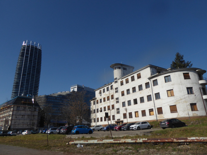 Am Fuße der Wolkenkratzer reihen sich die Lagerhäuser des Hafens aneinander wie die alten Reihen der Abbruchhäuser der Altstadt neben den ersten Platten. Auf den ersten Blick ist es schwer zu erkennen, welche noch genutzt werden und welche nicht. Das denkmalgeschützte Haus der Matrosen (Starý dom lodníkov, Július Lehocký, 1940-1942) gehört zu letzteren. Es ist ein modernistisches Gebäude, allerdings in einem etwas populäreren Stil als die Haupthalle. Die abgerundete Seitenfassade, die an ein Schiff erinnert, und das „Heck“ über dem Dach sind architektonische Ausdrucksformen, die leicht zu erfassen sind. Der Eingang wird von großen Kiefern beschattet.